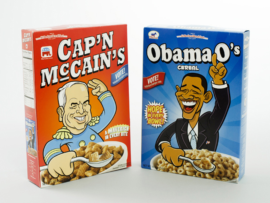 Fue entonces cuando la mente brillante y oportunista del trío comenzó a trabajar, y una vez más aprovecharon el contexto político previo a las elecciones presidenciales y crearon cajas de cereales con las caras de los candidatos presidenciales Barack Obama, candidato demócrata, y John McCain, candidato republicano.